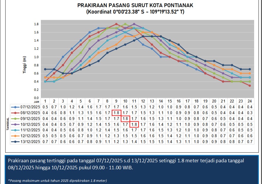 Berdasarkan grafik Prakiraan Pasang Surut Kota Pontianak, puncak pasang tertinggi terlihat pada tanggal 8 Desember, 9 Desember, dan 10 Desember 2025, terjadi antara pukul 09.00–11.00 WIB. Data menunjukkan bahwa ketinggian pasang mencapai 1,8 meter, sesuai dengan batas maksimum pasang air laut yang diperkirakan BMKG untuk tahun 2025.