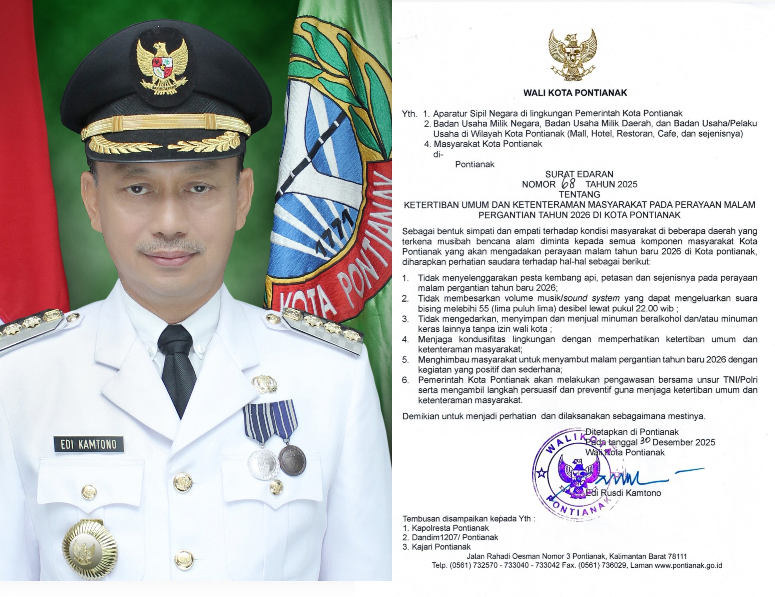 PONTIANAK — Pemerintah Kota Pontianak resmi menerbitkan Surat Edaran Wali Kota Pontianak Nomor 08 Tahun 2025 tentang Ketertiban Umum dan Ketenteraman Masyarakat pada Perayaan Malam Pergantian Tahun 2026 di Kota Pontianak. Surat edaran tersebut ditetapkan di Pontianak pada 30 Desember 2025 dan ditandatangani langsung oleh Wali Kota Pontianak, Edi Rusdi Kamtono.