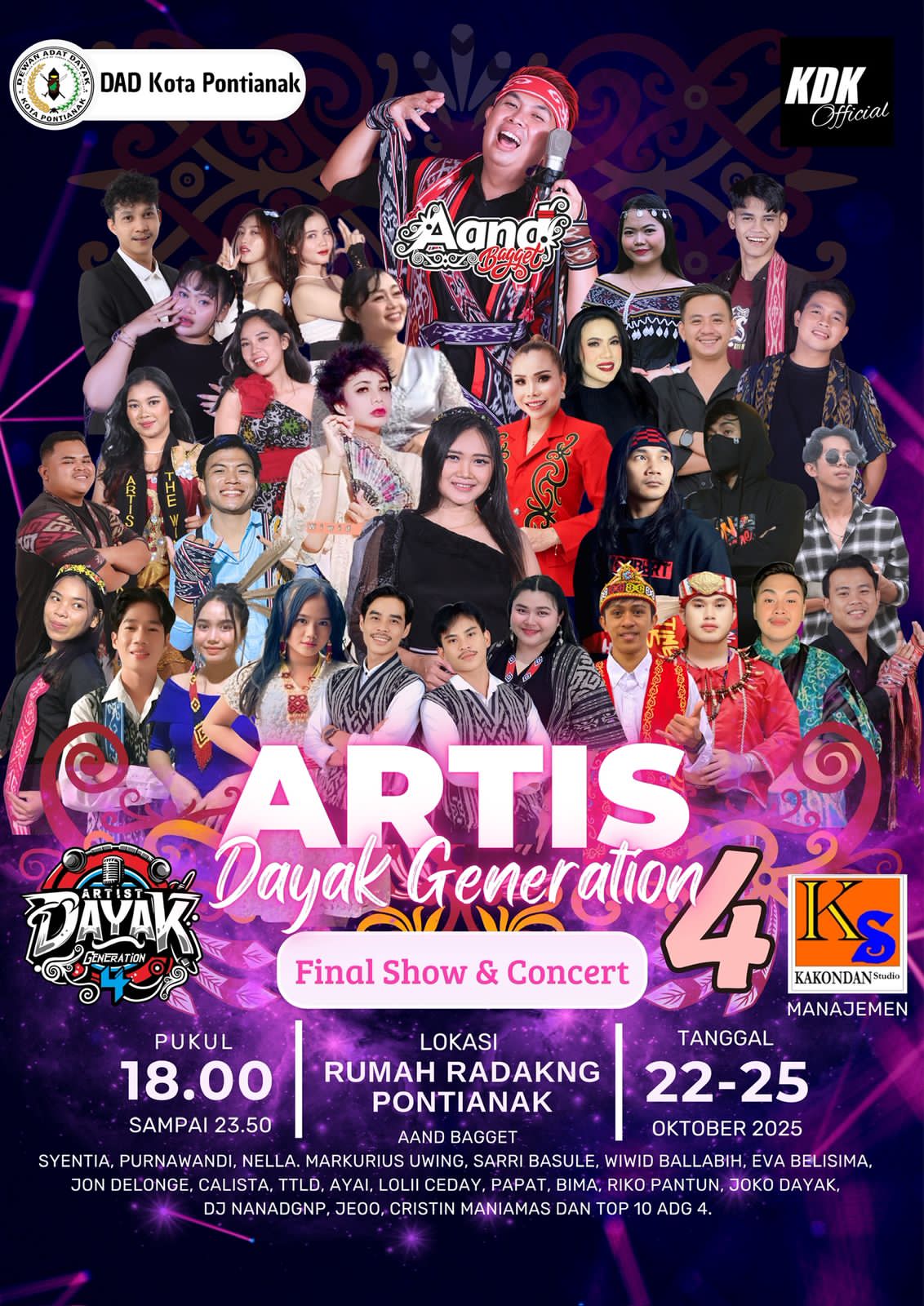 PONTIANAK – Ajang pencarian bakat dan konser terbesar bagi musisi muda Dayak, Artist Dayak Generation (ADG) 4, siap digelar spektakuler di Rumah Radakng Pontianak pada 22–25 Oktober 2025. Event tahunan yang dipersembahkan oleh Dewan Adat Dayak (DAD) Kota Pontianak bersama Kakondan Studio dan KDK Official ini menghadirkan deretan artis muda berbakat serta musisi papan atas Dayak.