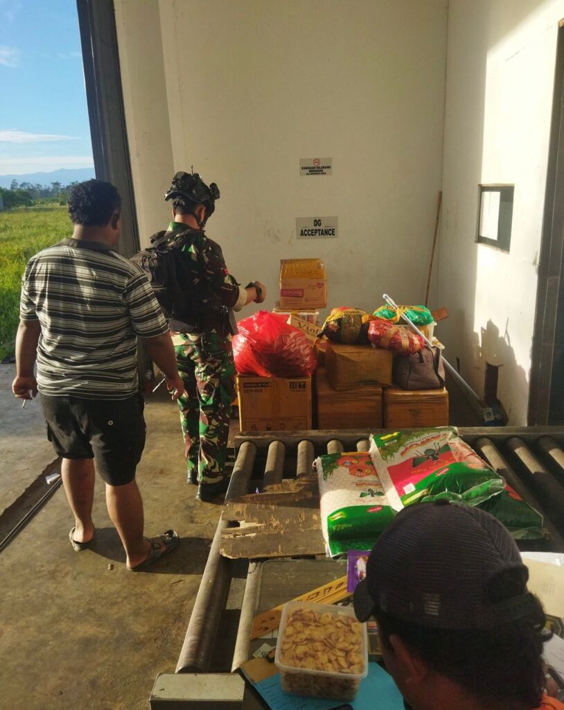 Selain kendaraan, pengawasan ketat juga diberlakukan pada sektor distribusi barang. Tampak prajurit TNI turut mengawal dan memeriksa tumpukan paket dan kargo di area penerimaan barang berbahaya (DG Acceptance / Dangerous Goods).