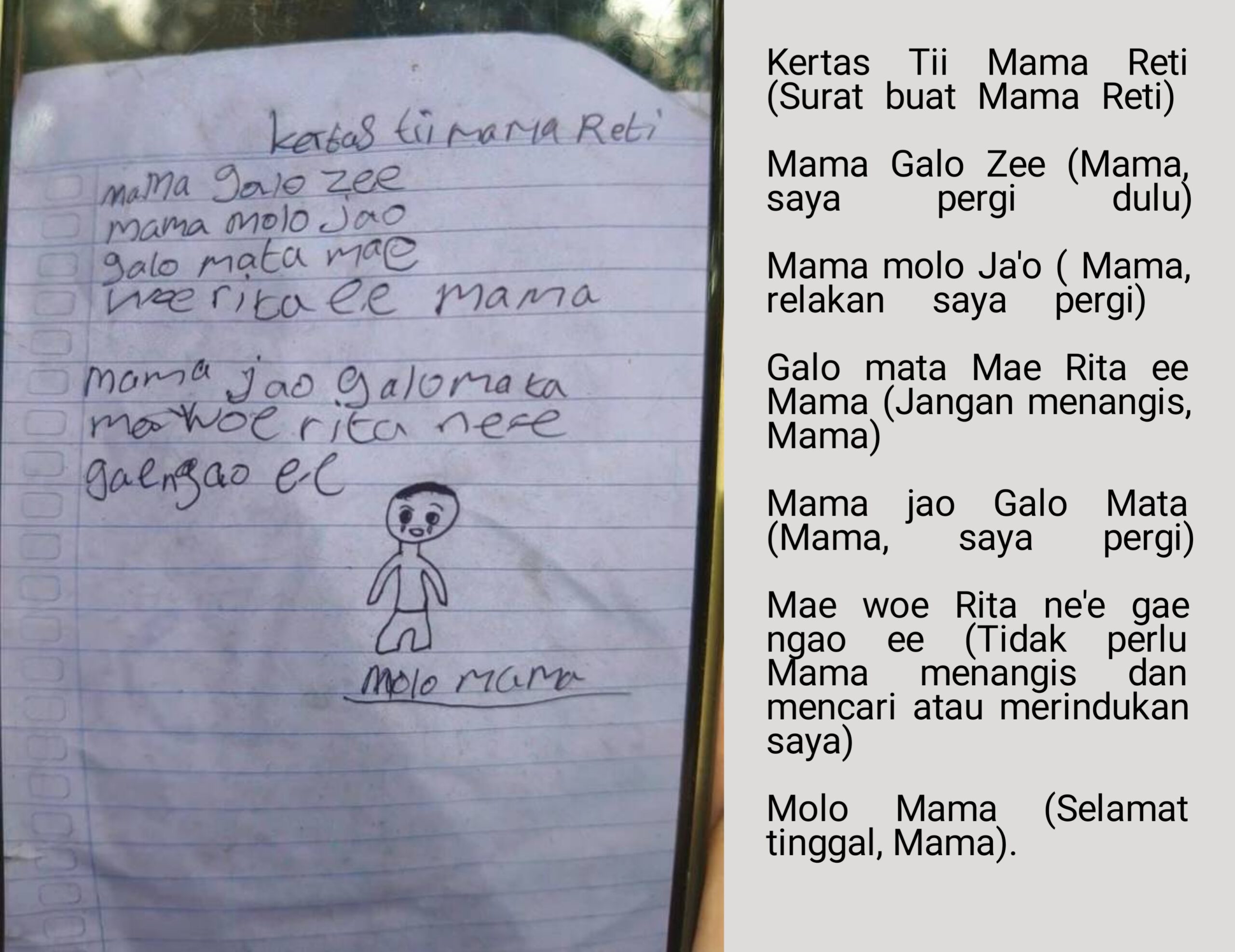 Dalam penanganan di lokasi, petugas menemukan sebuah catatan tulisan tangan yang diduga ditujukan kepada orang tua korban, catatan itu berisi pesan perpisahan dan permohonan agar sang ibu tidak bersedih.