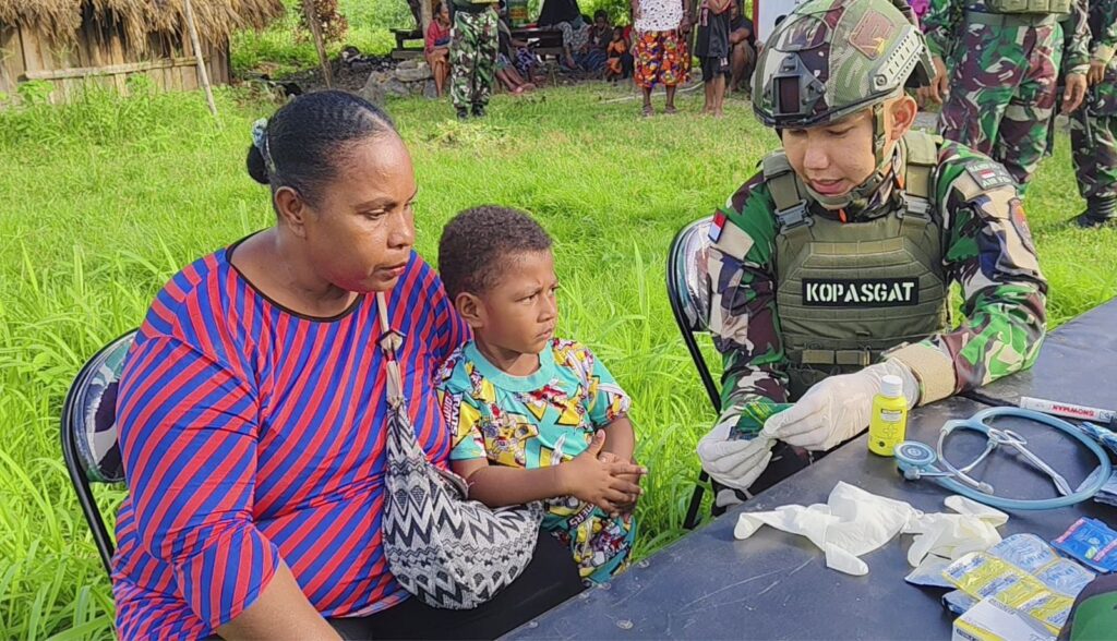 “ujar Dokter Satgas Yon Parako 466 Kapten Kes dr. Hamdi.Pelayanan ini tidak hanya menyasar orang dewasa. Anak-anak balita pun turut mendapatkan perhatian. Dalam salah satu momen yang hangat, seorang prajurit medis (ditandai dengan ban lengan palang merah) tampak tersenyum ramah saat berinteraksi dengan seorang anak kecil yang duduk di pangkuan keluarganya.