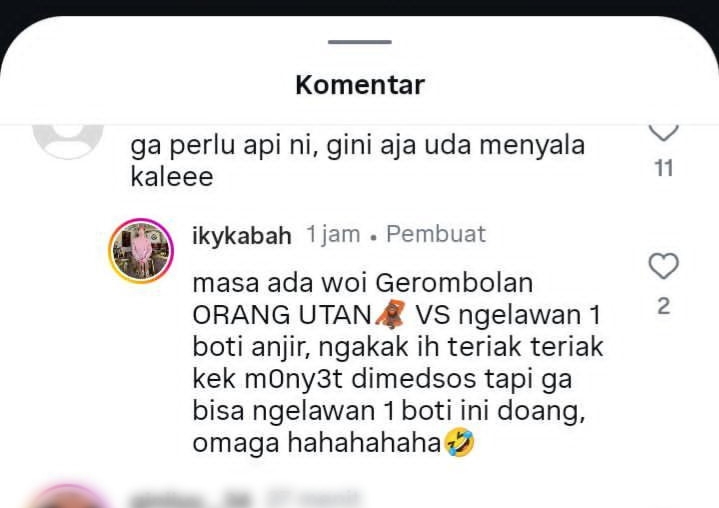 “Statement yang paling menyakiti perasaan saya bukan dari konten yang dibuat pelaku, tetapi dari komentarnya yang berkata: ‘Monyet-monyet turun dari hutan melawan satu boti.’ Kalimat ini sangat membuat saya sakit hati dan emosi,” katanya dengan tegas.